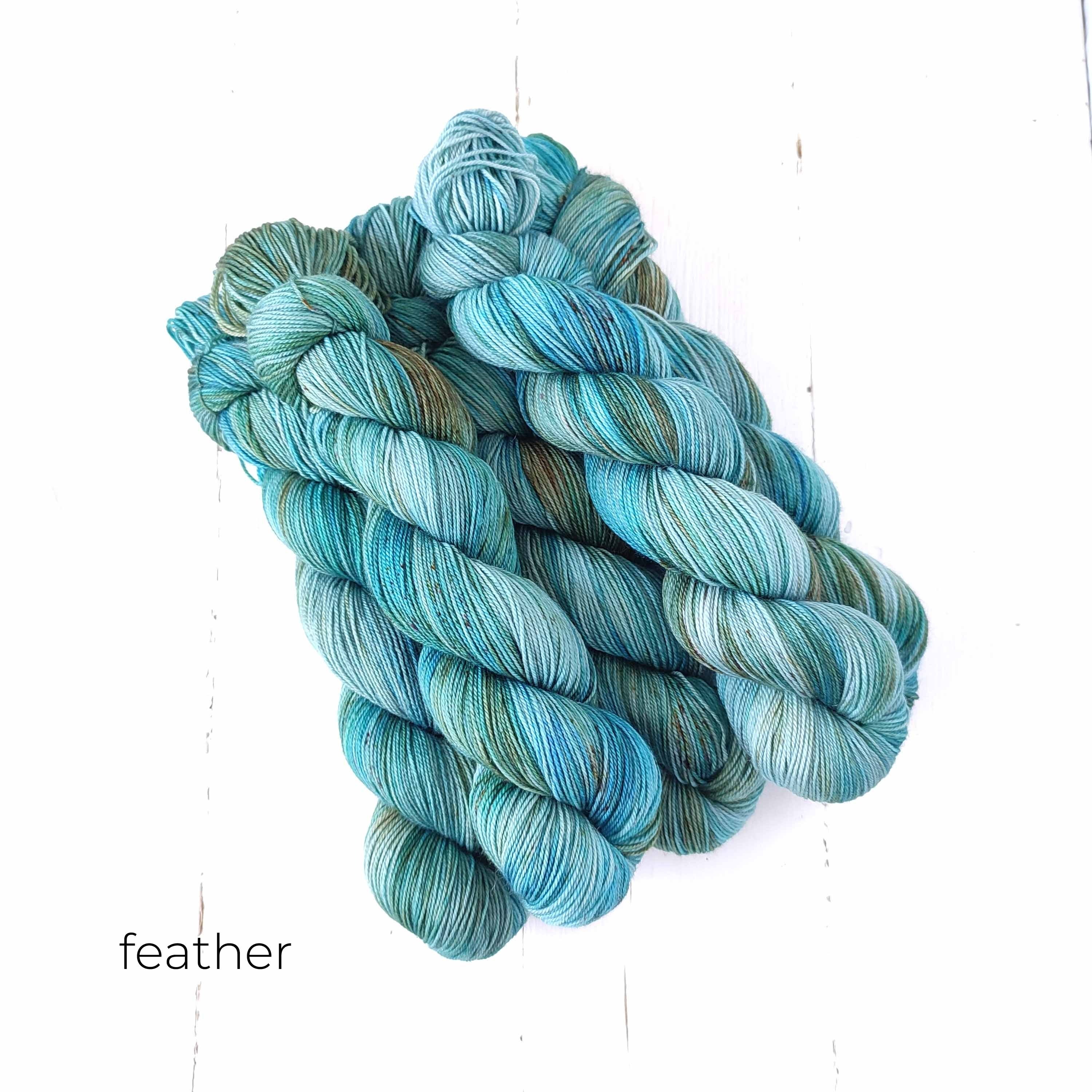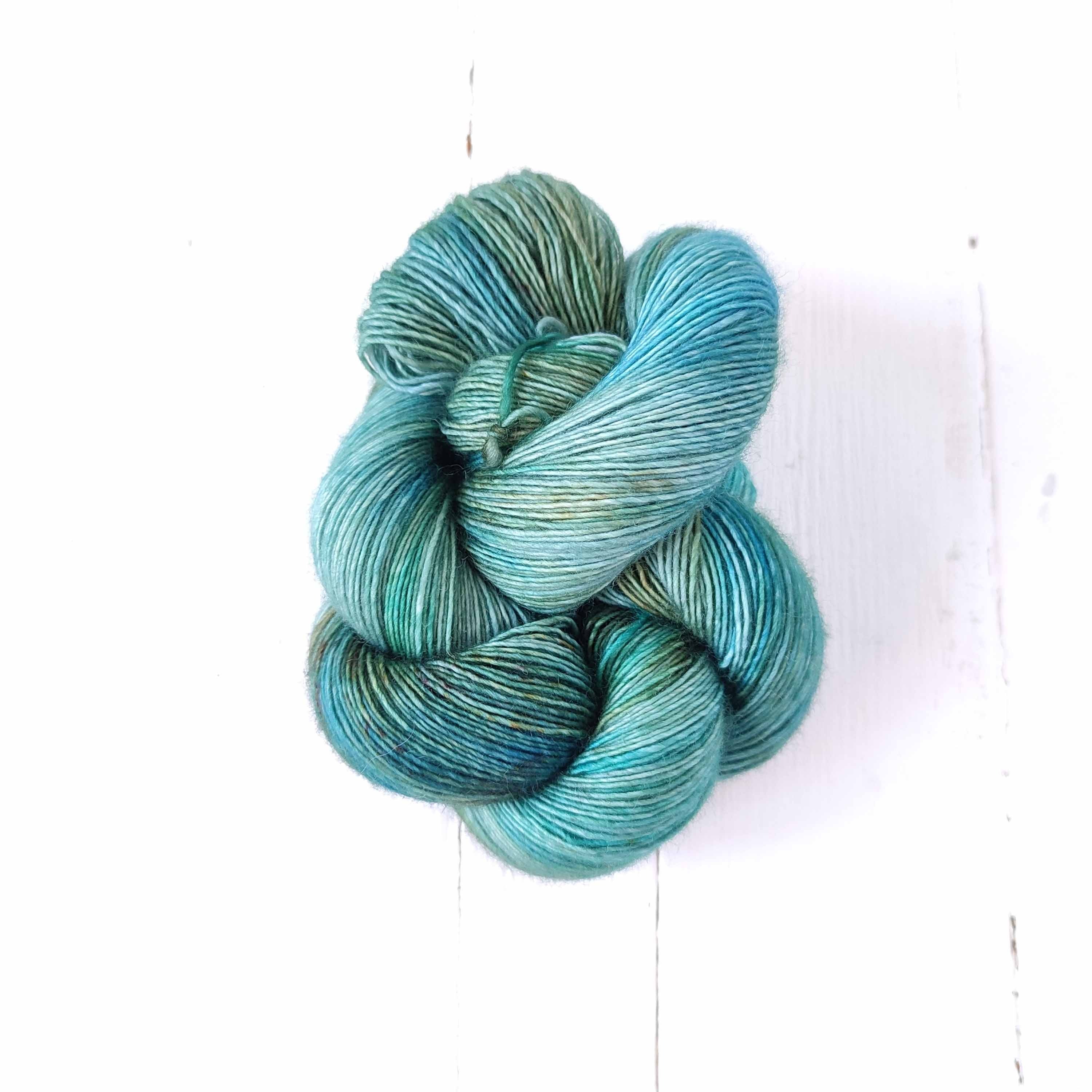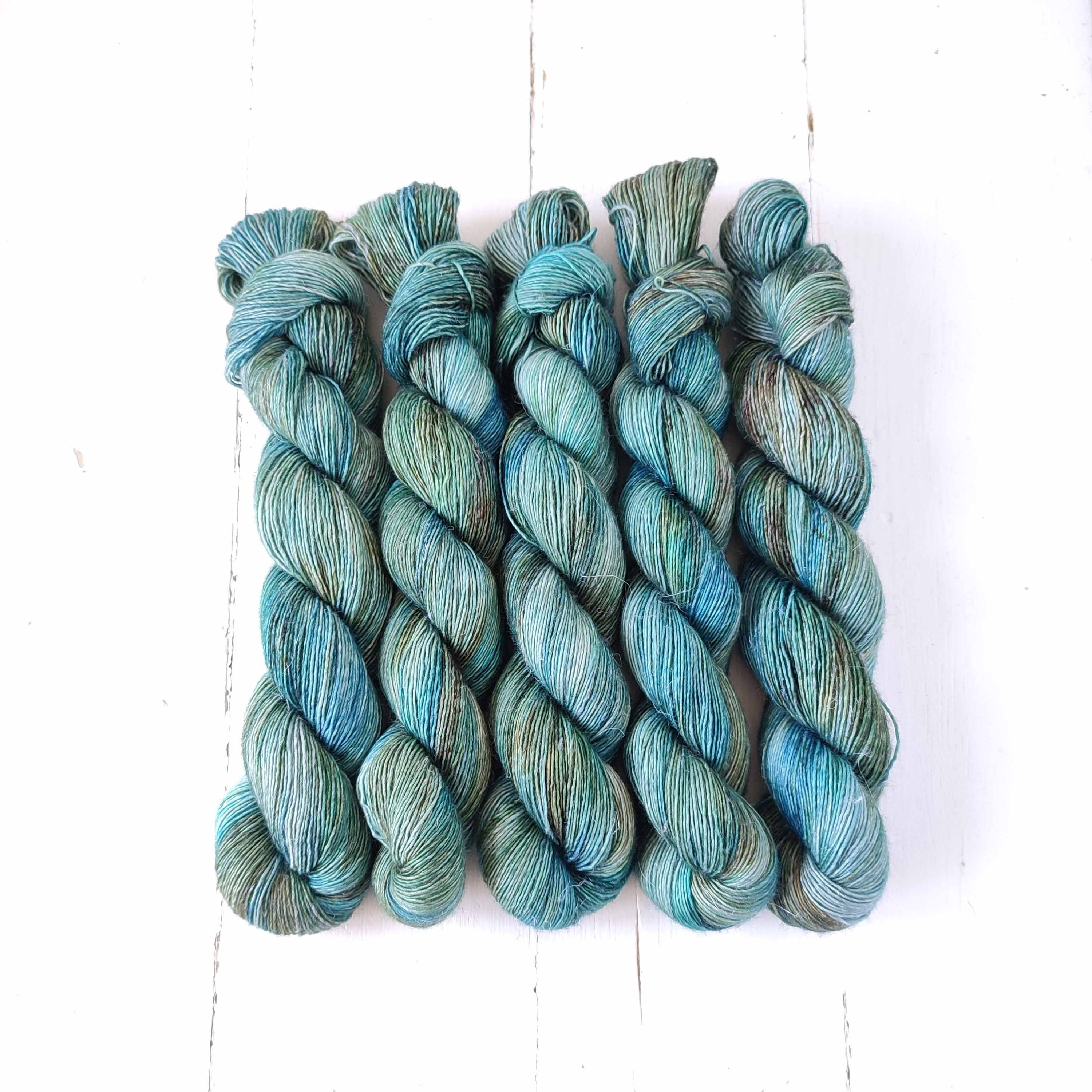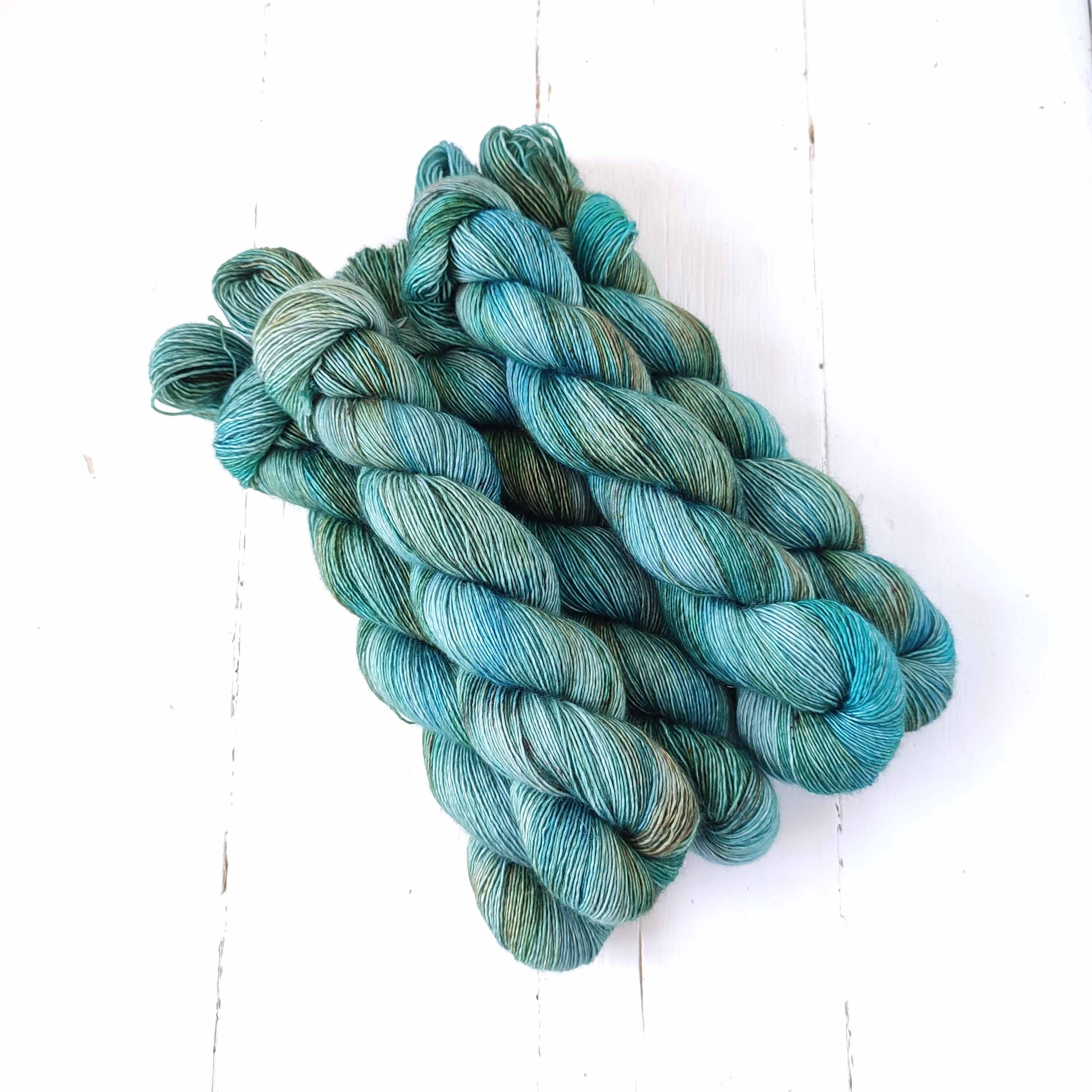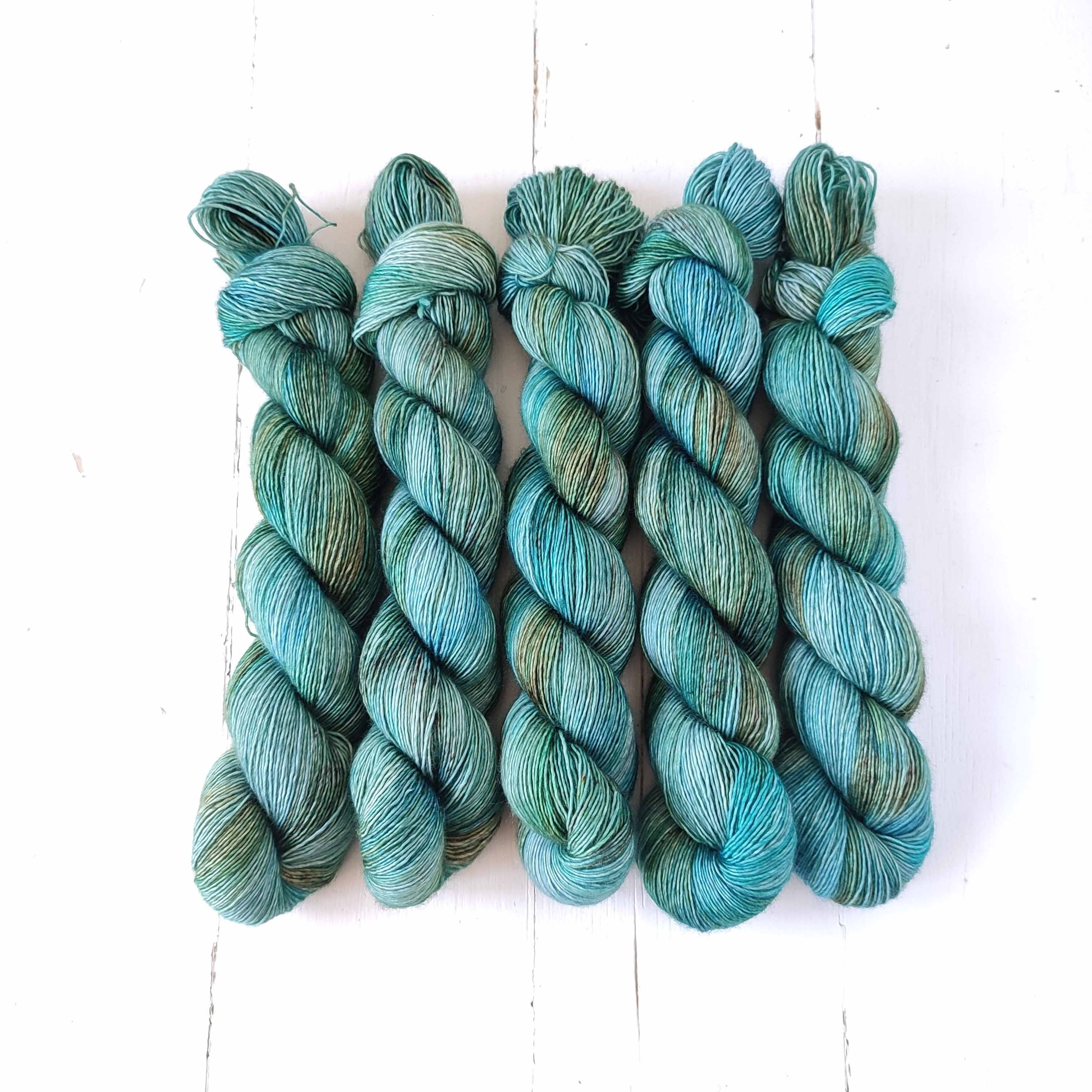 Mutiny is a colourway that has been kicking around in my head for a while - it sits somewhere between Galleon and Shipwrecked in tone. Think tropical ocean waters - turquoises and teals, marine blues with a hint of woody tones (sunken treasures) thrown in. There are delicate speckles layered onto this for added visual texture.