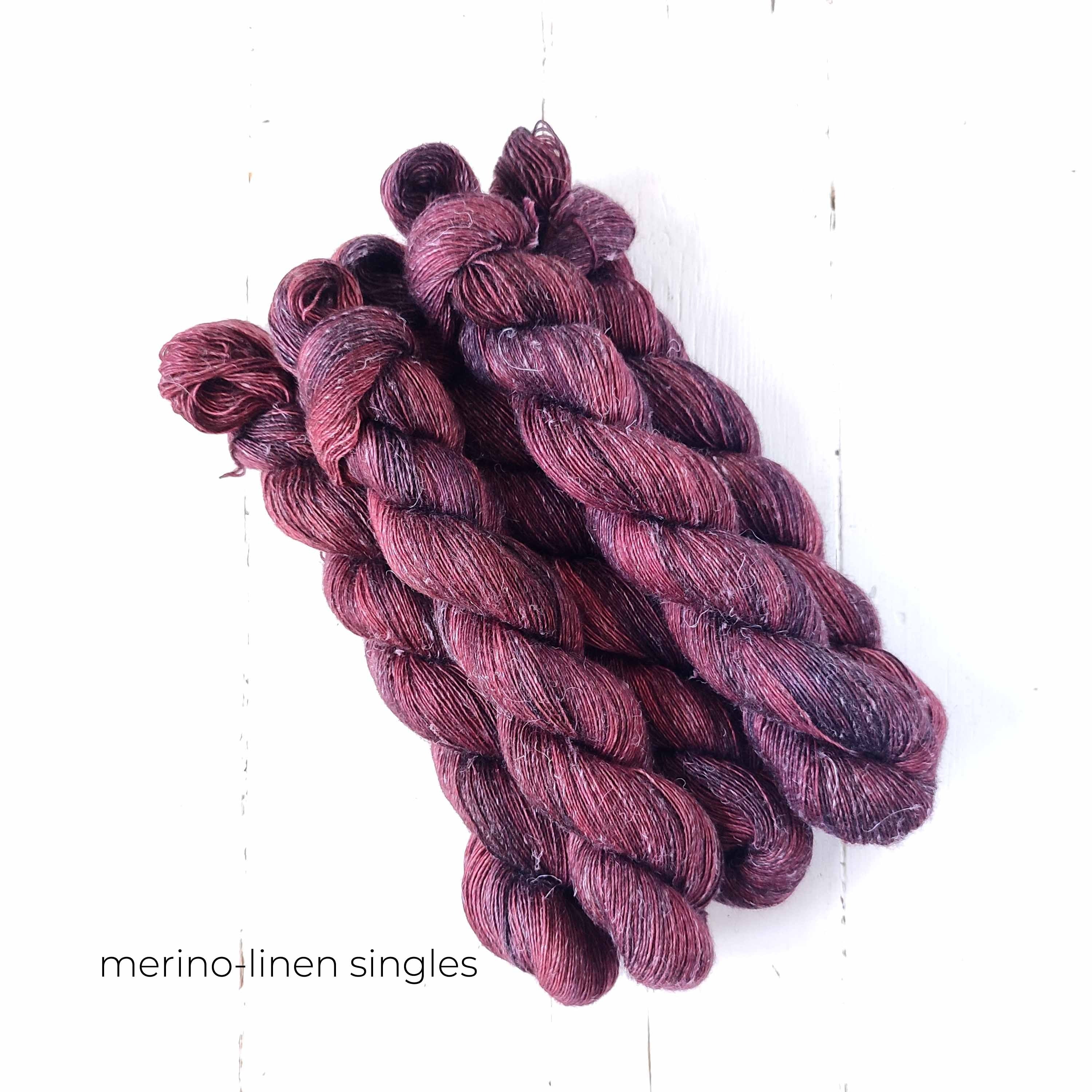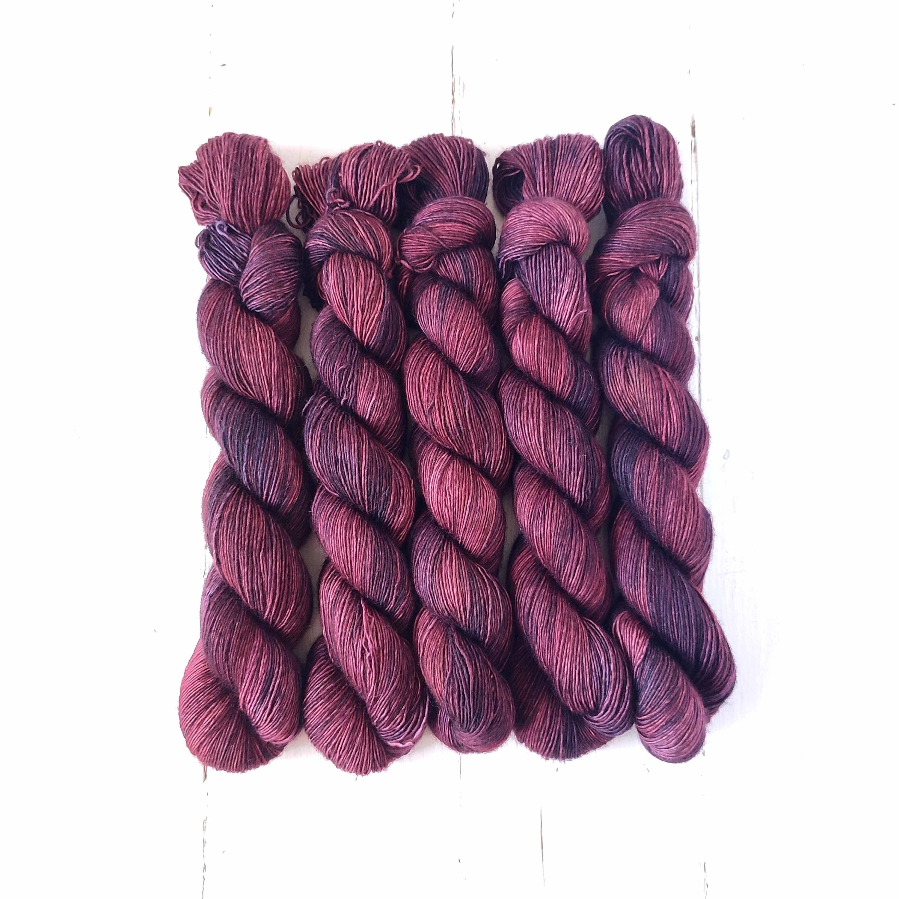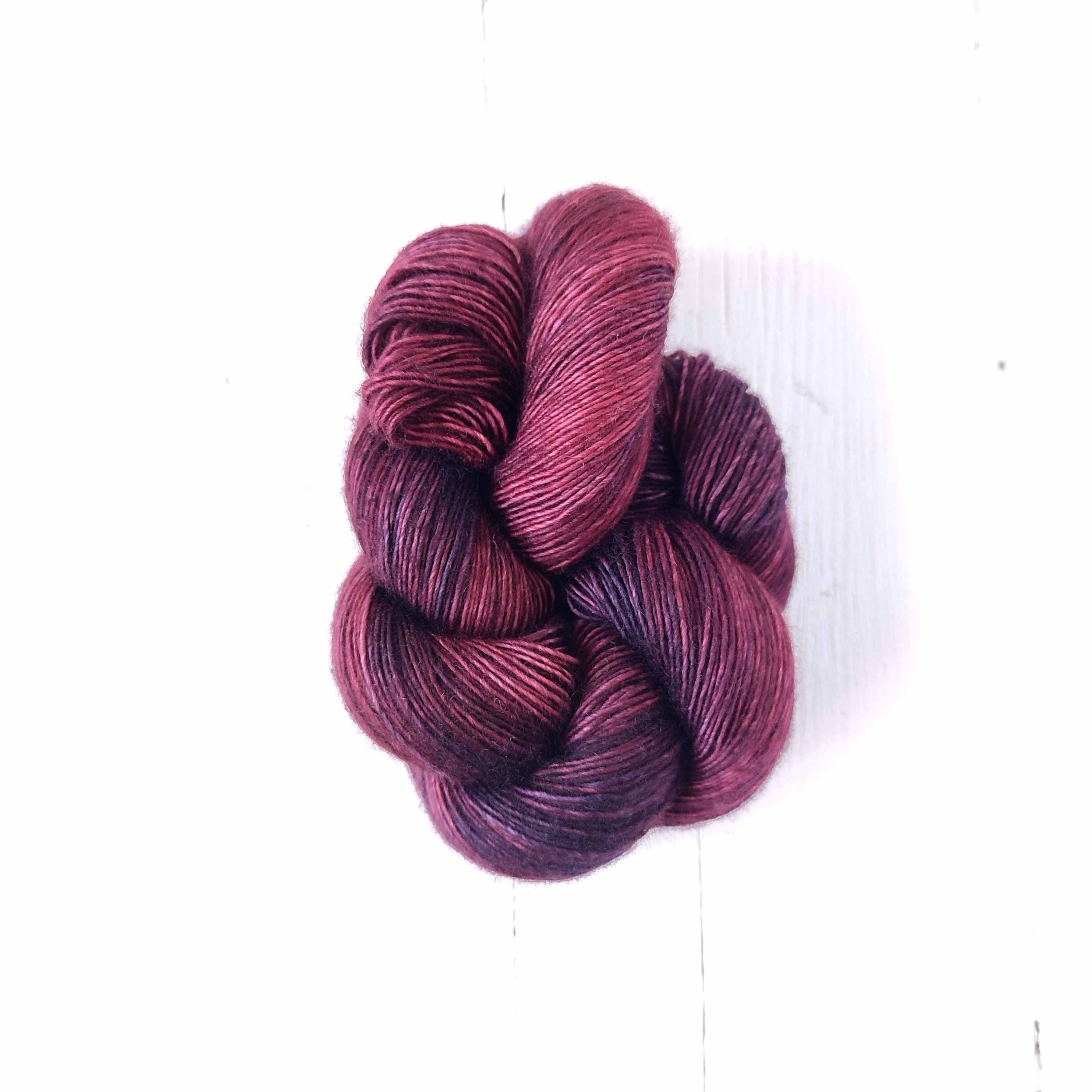 Think of all the beautiful deep reds of a perfect red wine - layered and heavy-bodied; cosy and comfortting. This is a very deep, dark and saturated burgundy red - please take care when using this colourway with lighter colours (the red dyes are big culprits here - so only quick soaks for your knits...not long, soaking baths please!).