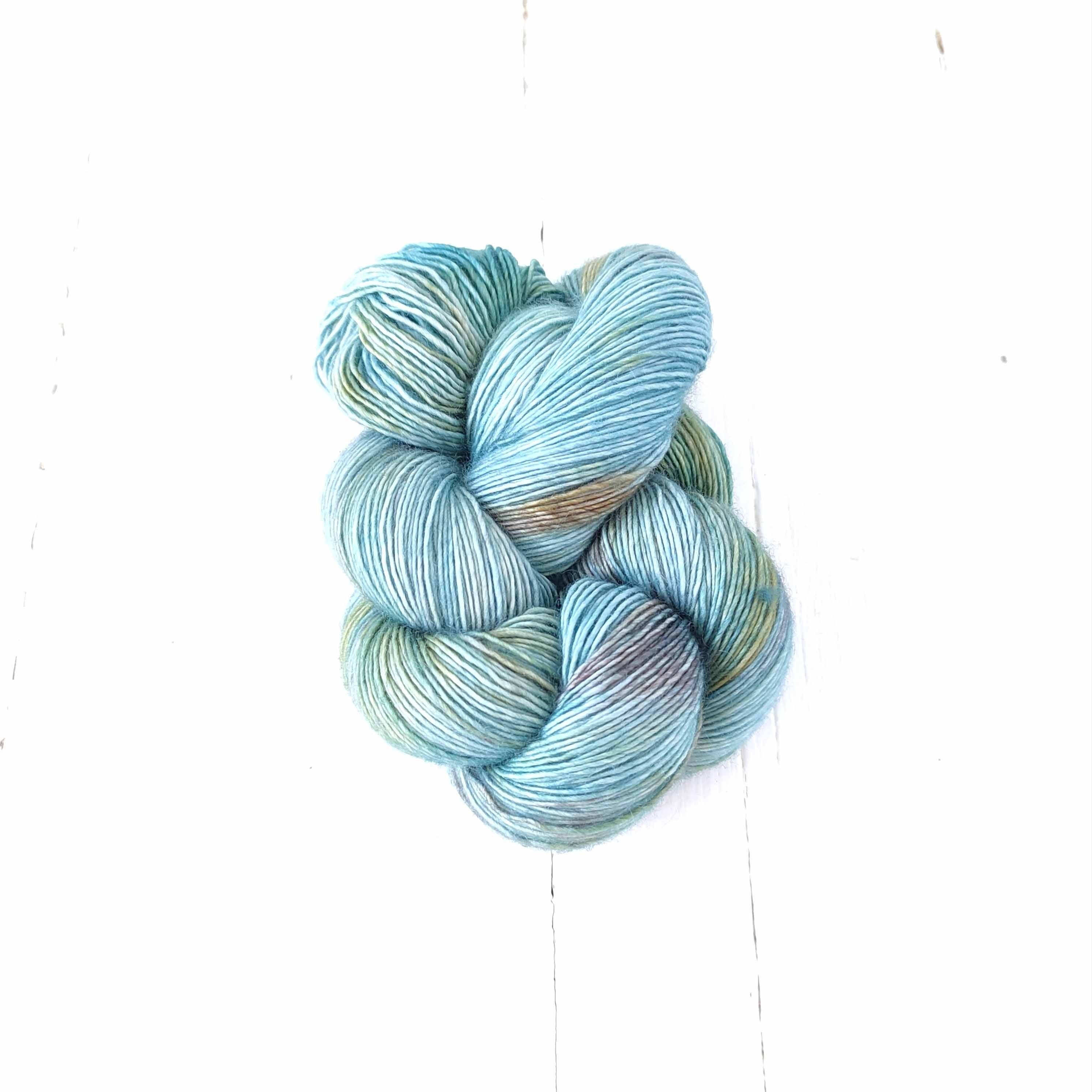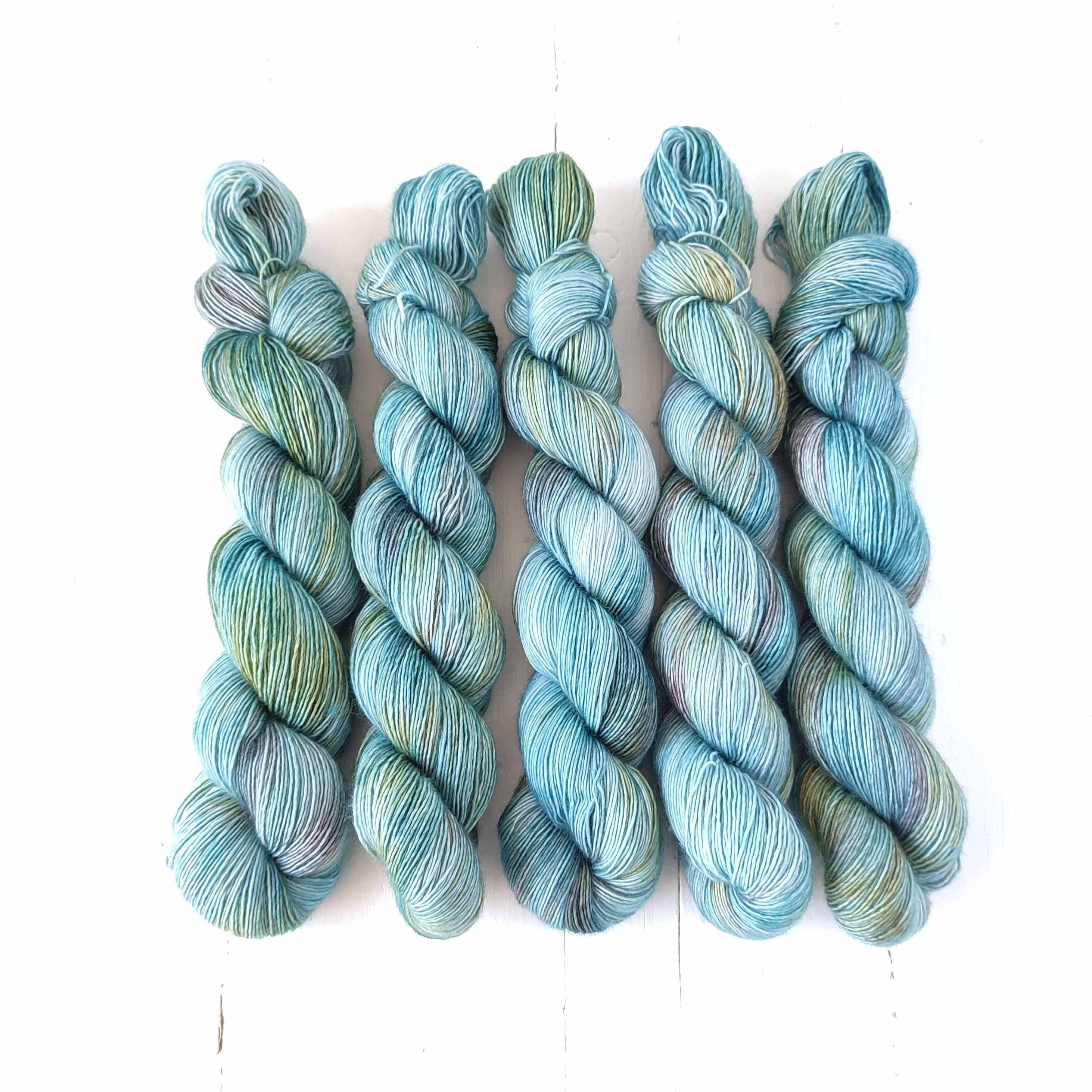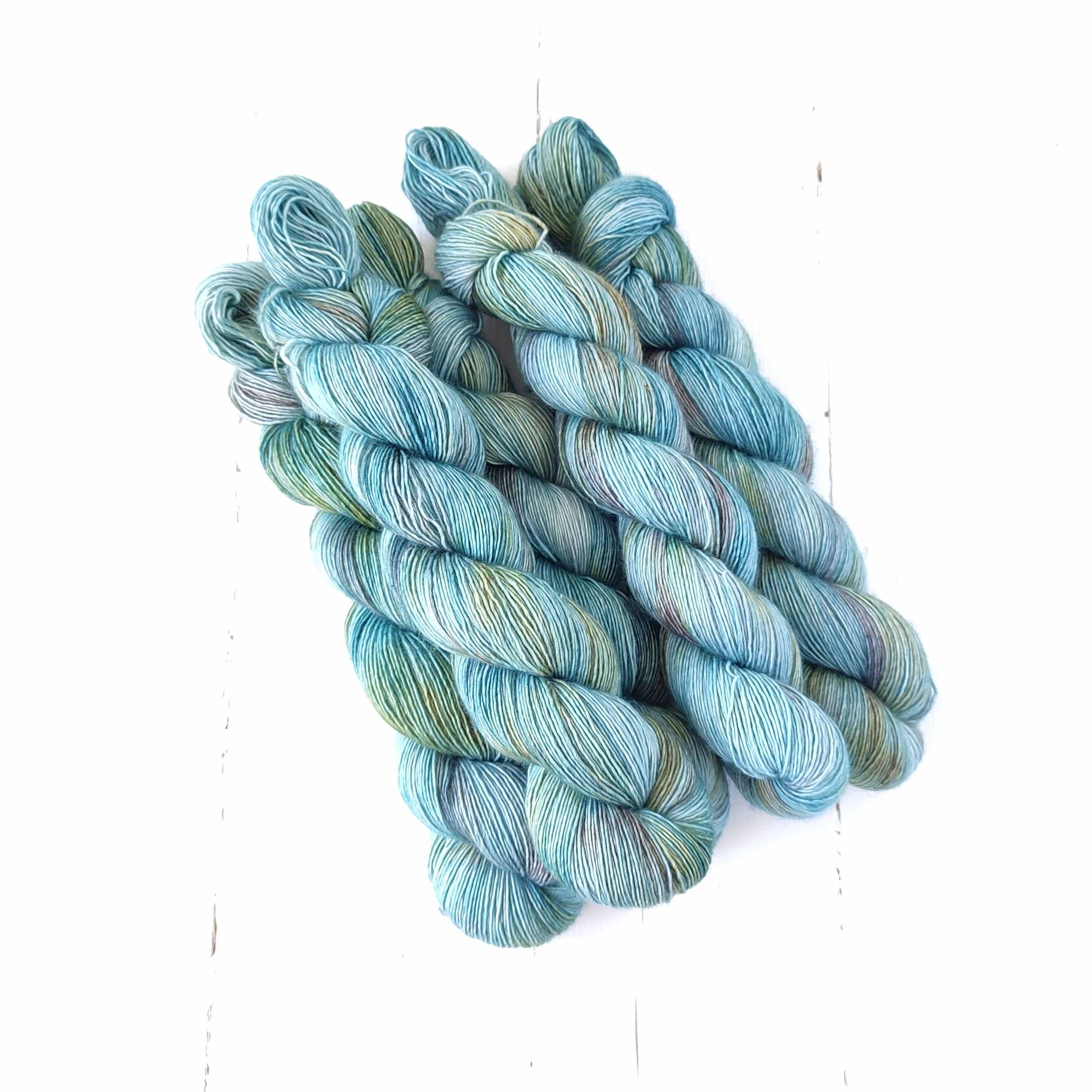 Shipwrecked is a light to medium variegated colourway that combines notes of pale teal, silvery teals, and darker teal with delicate layers of gold and pale brown.
