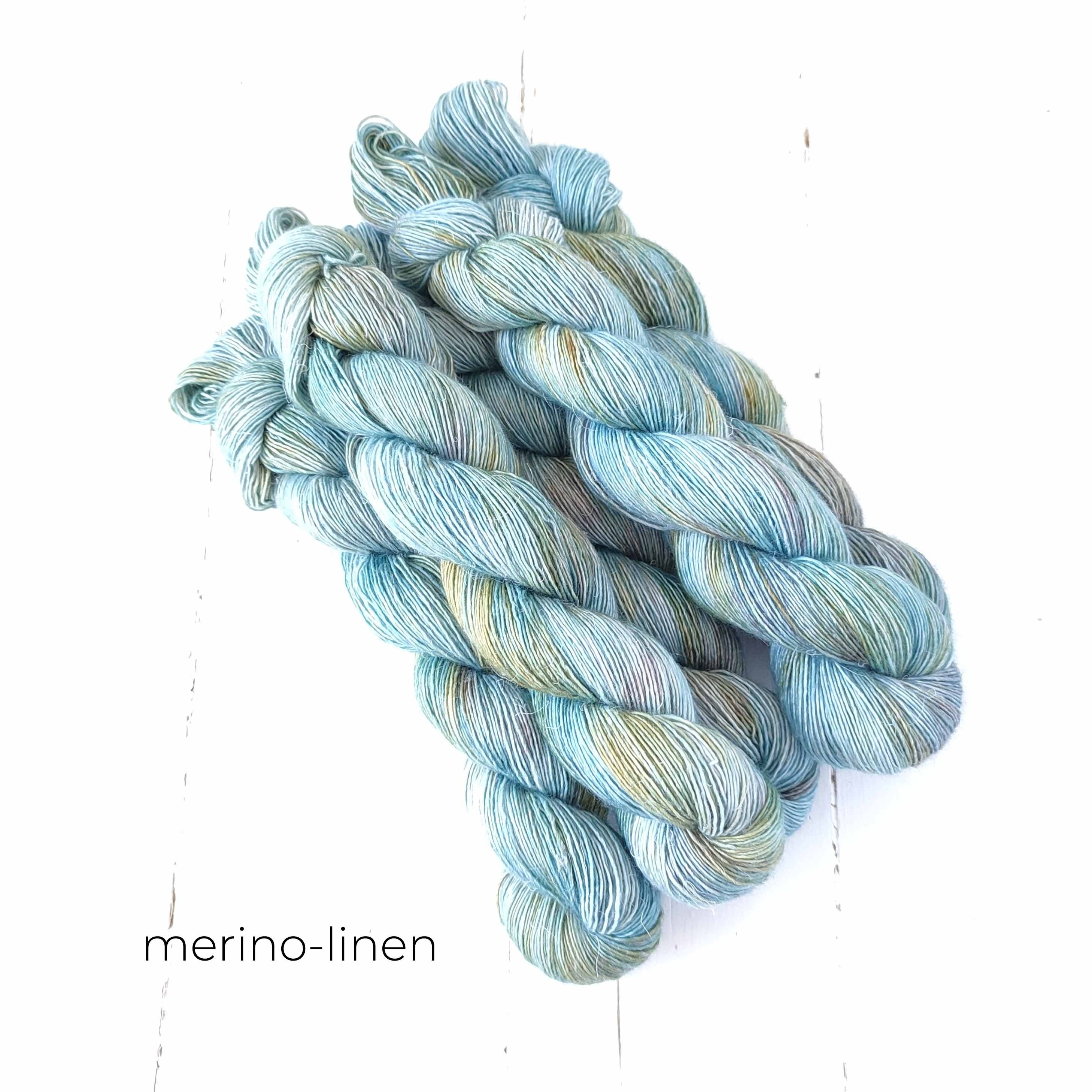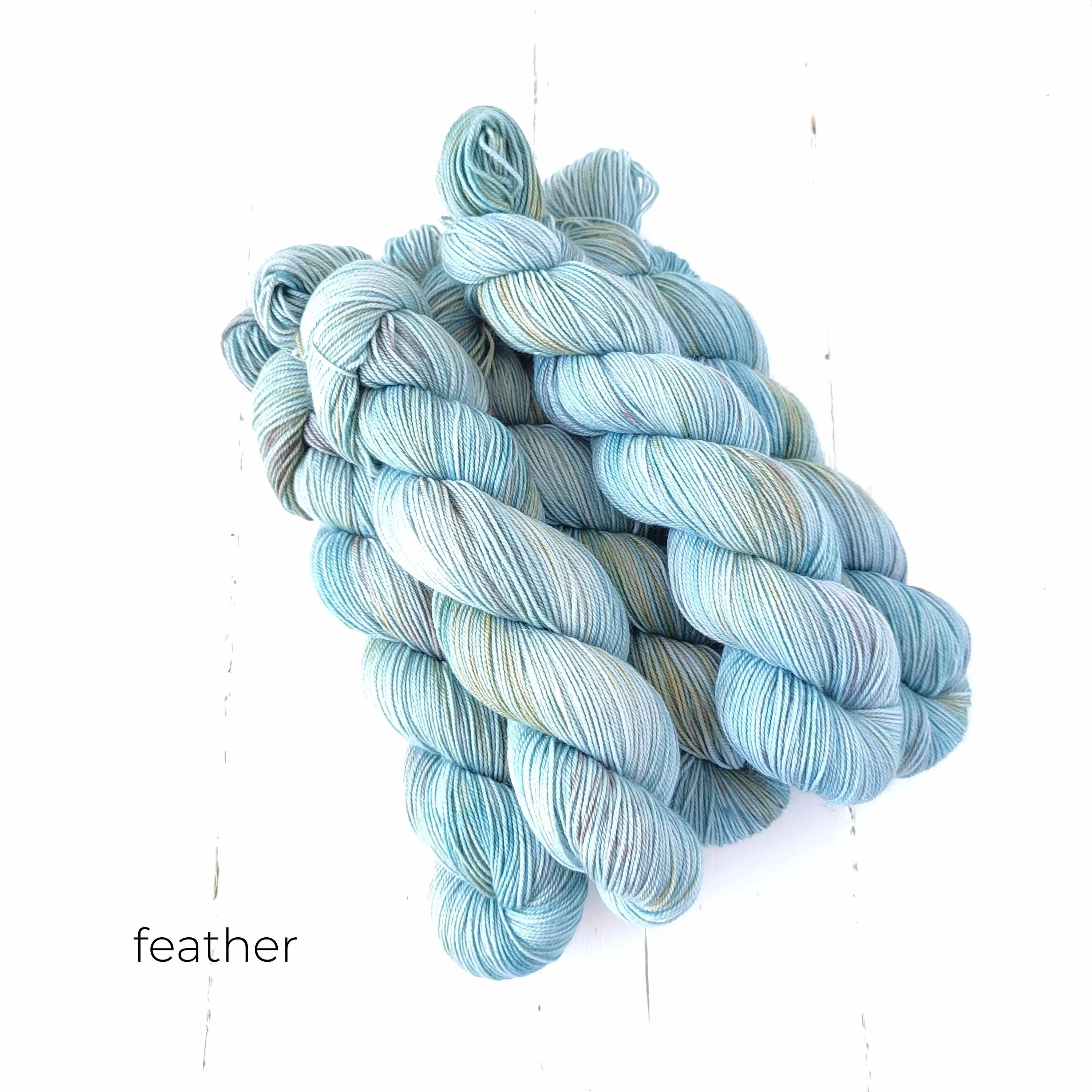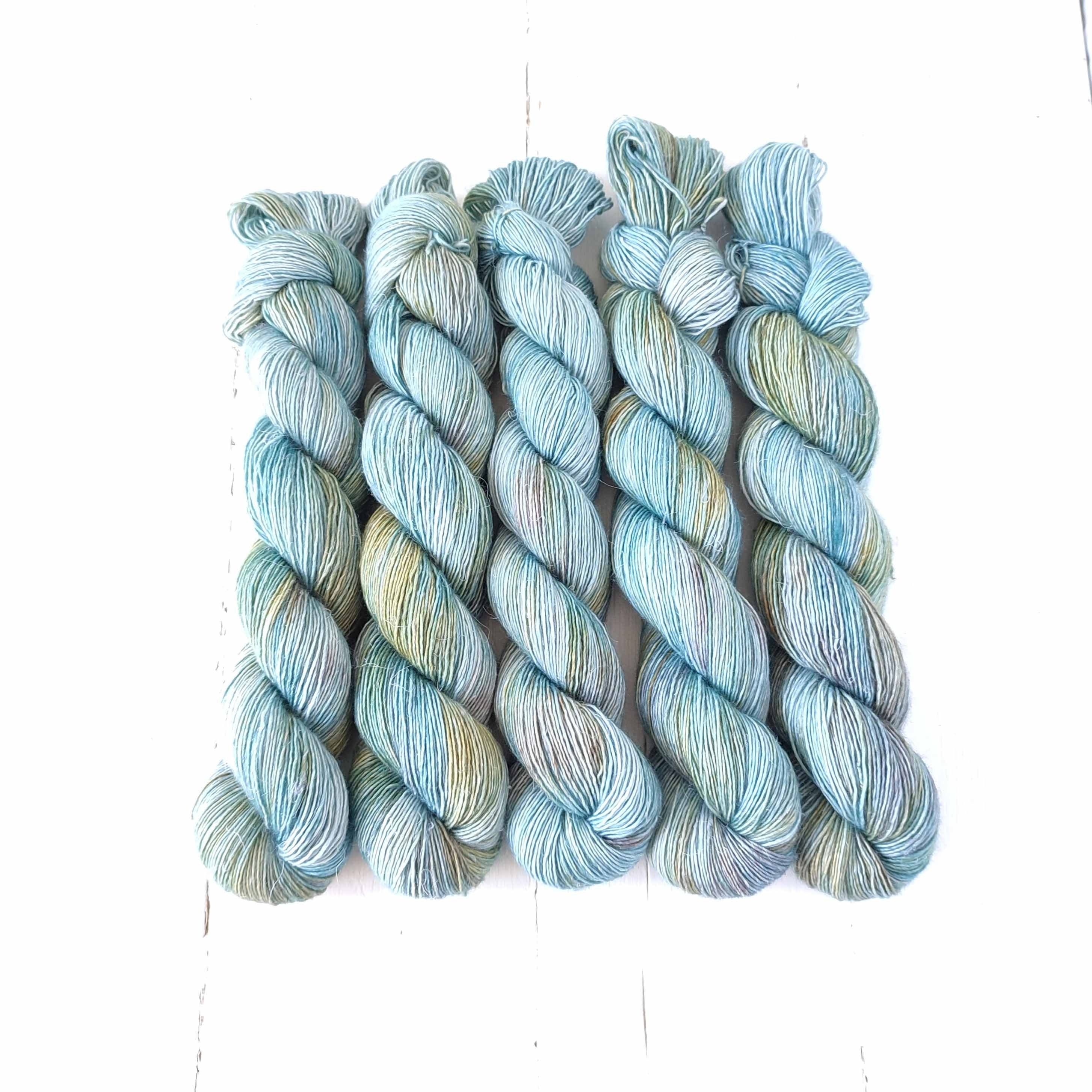 Shipwrecked is a light to medium variegated colourway that combines notes of pale teal, silvery teals, and darker teal with delicate layers of gold and pale brown.