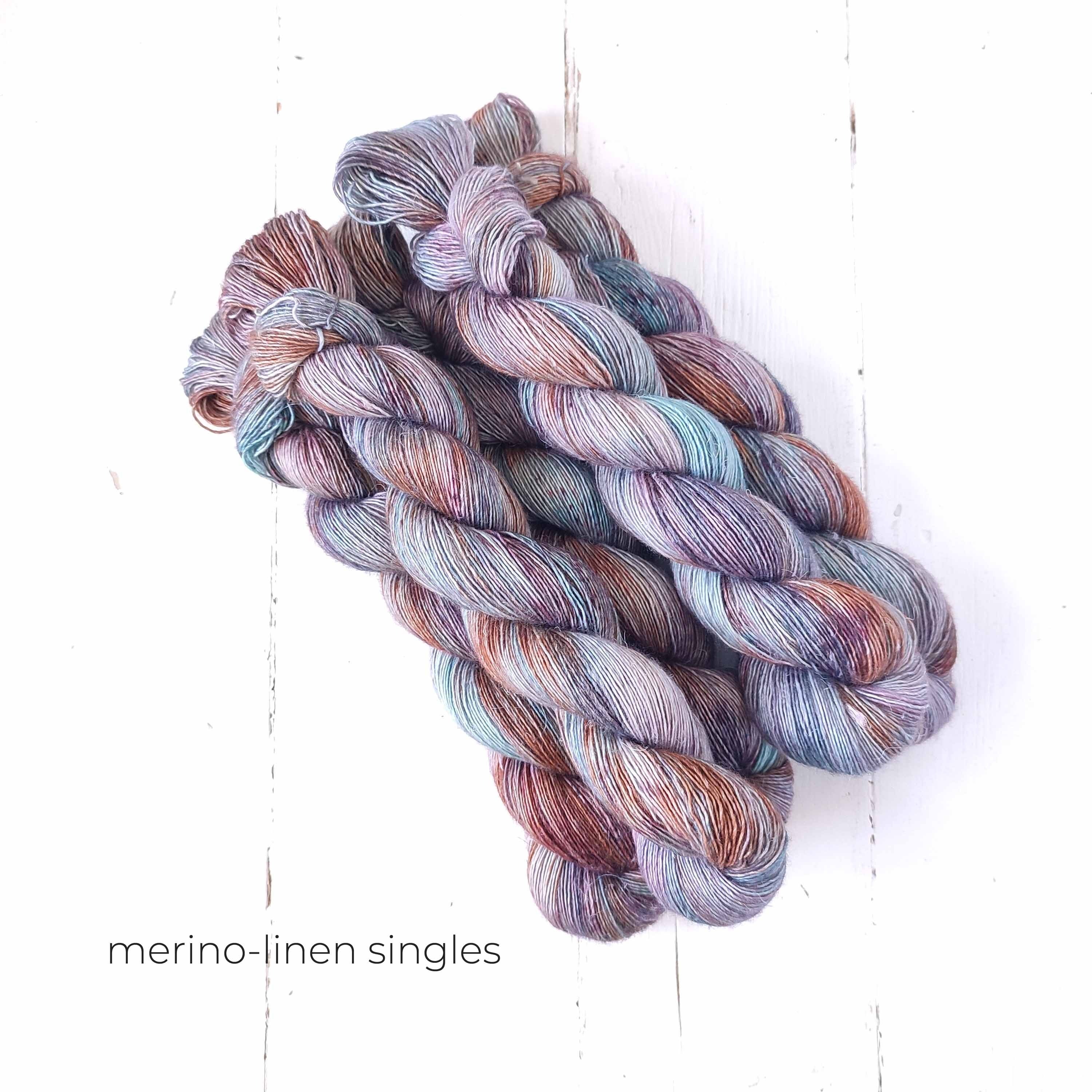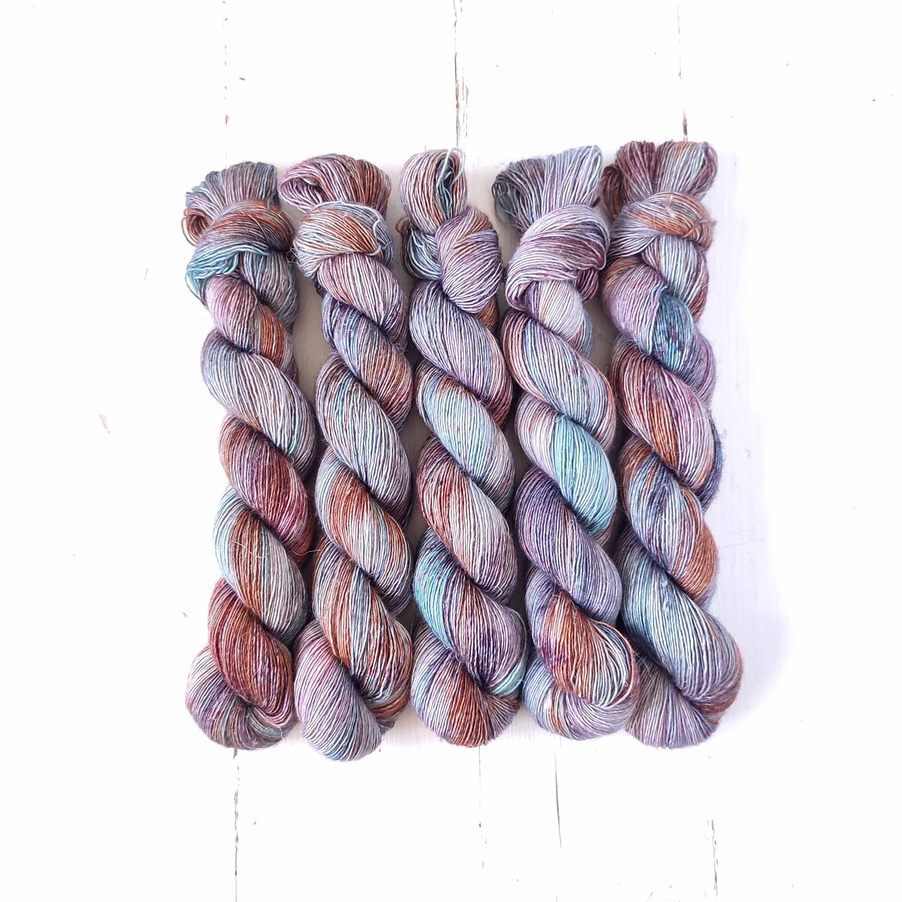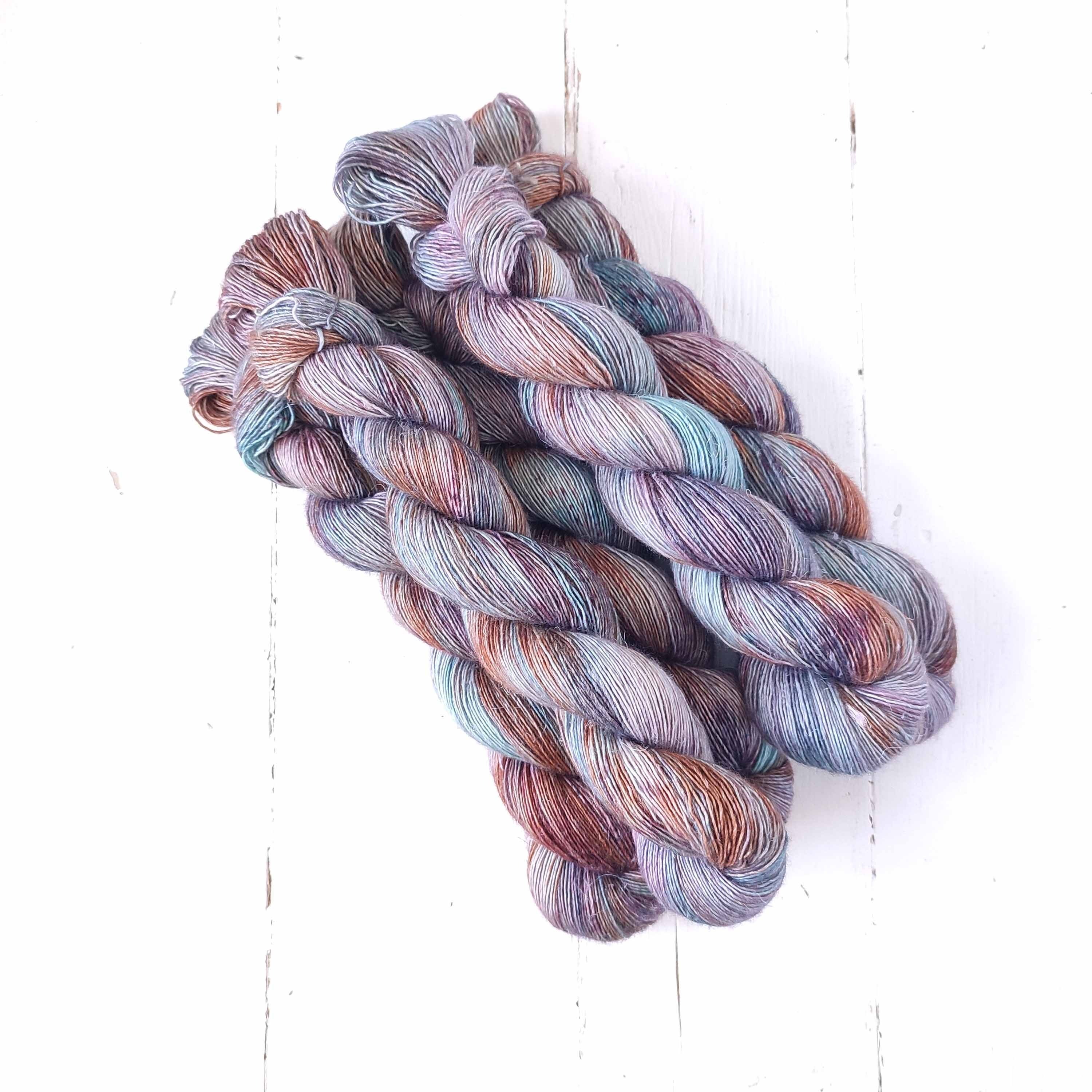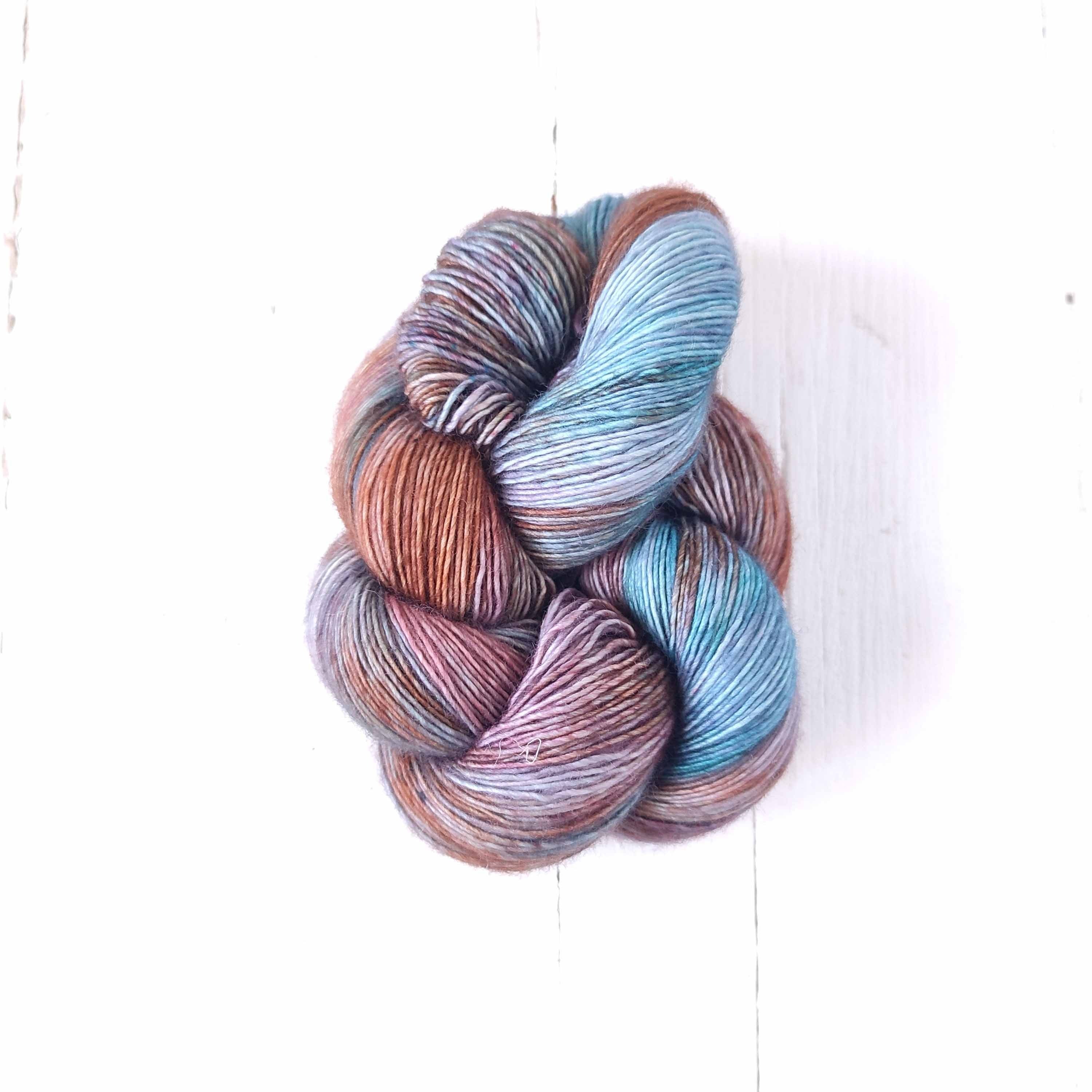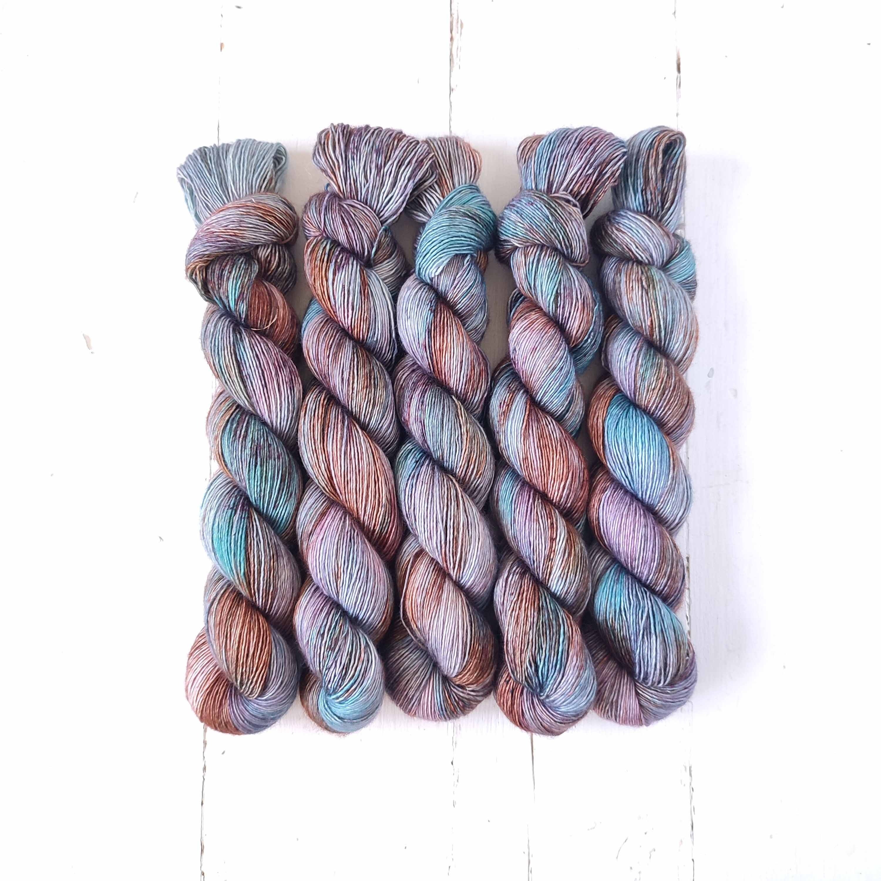 Weathervane is a colour that has long eluded me - I have made various iterations over the years, but this version is delish. Its a pale blue layered with various rusts and steel colours - and ultimately it does not show up as 'blue' at all when wound! It does make for an interesting variegeted colourway that I am hoping to use in some future projects!